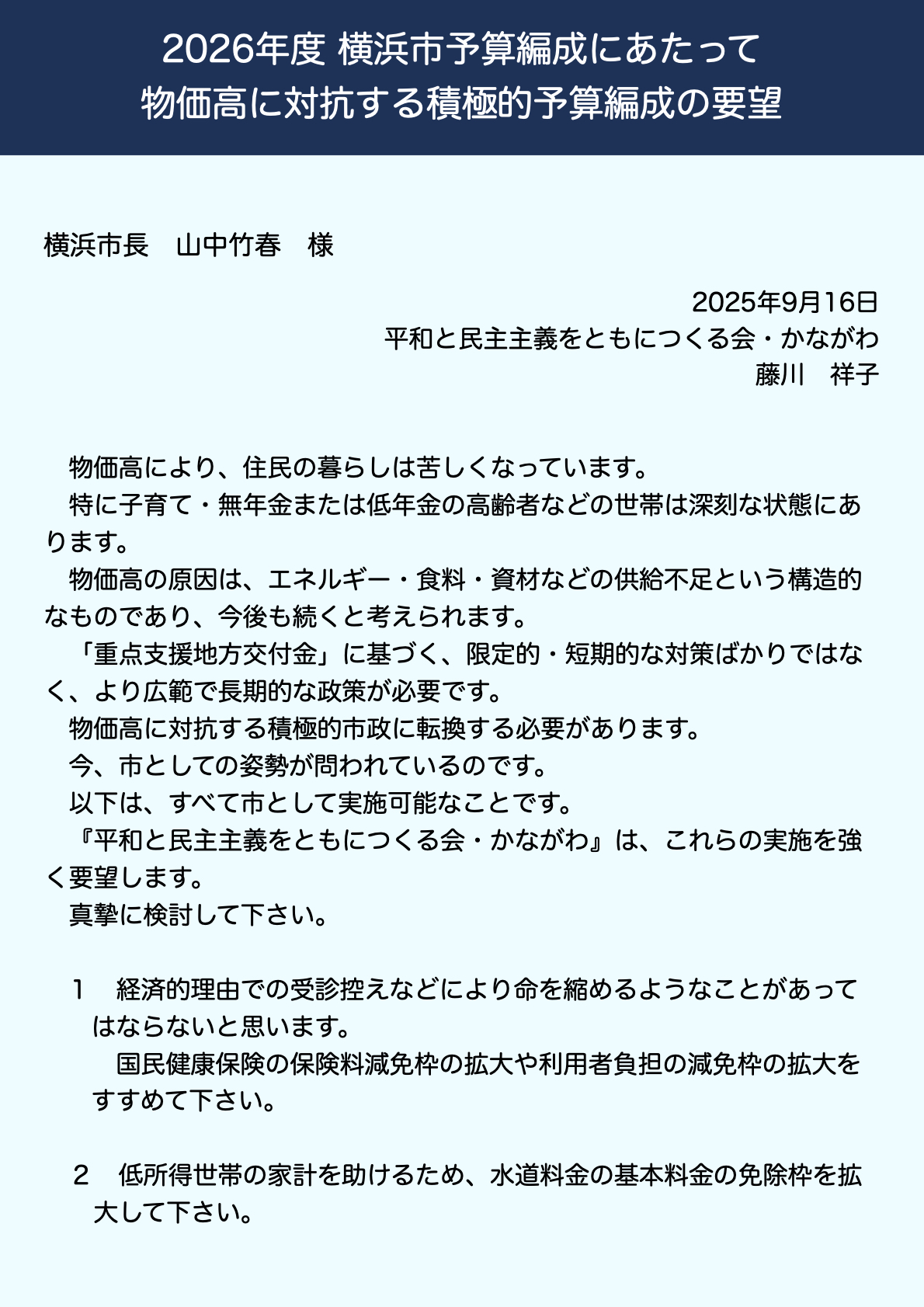 「横浜市長選に向けての政策要望書」(クリックして下さい。「要望書」へ)