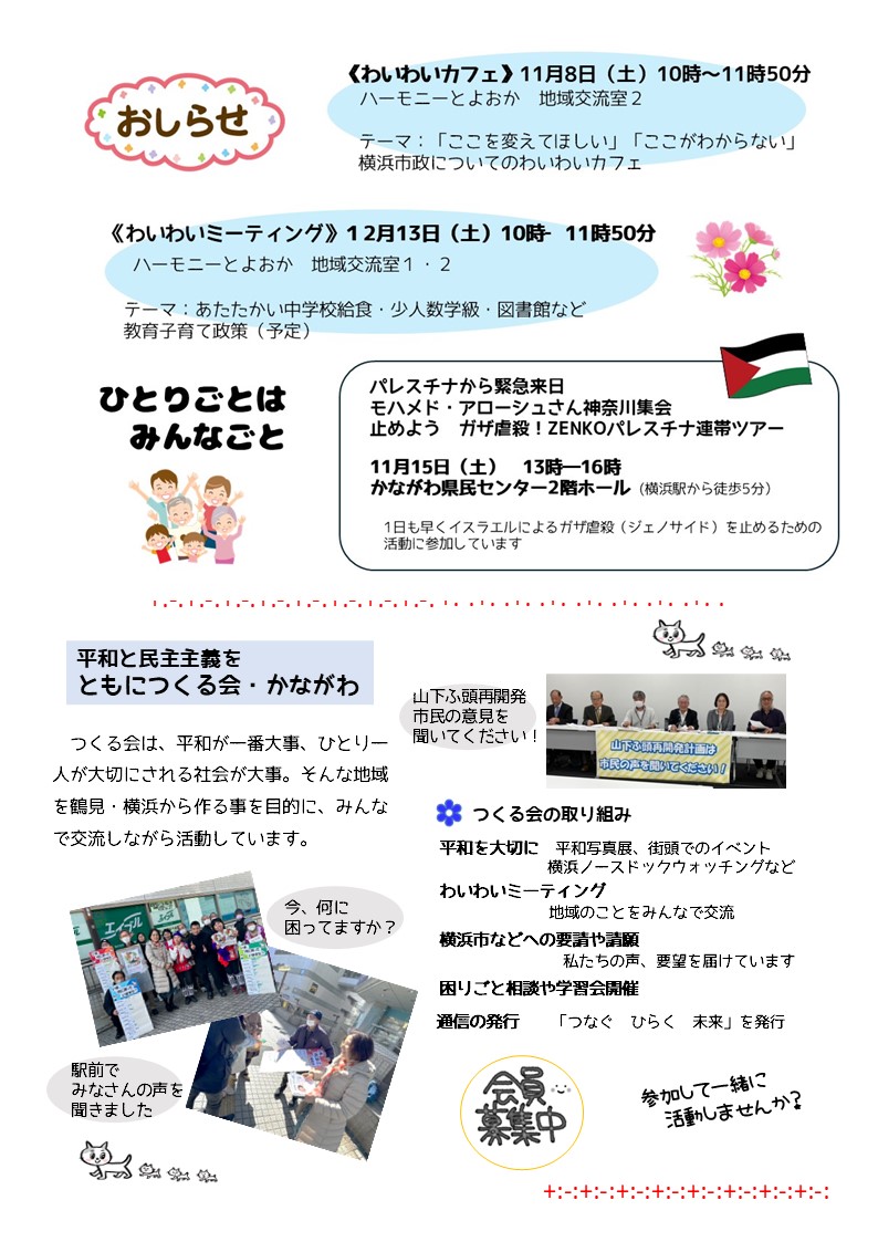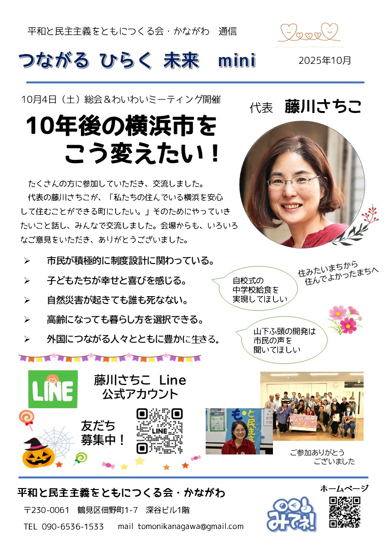 HOME > news > news つながる ひらく 未来 mini 2025年10月14日 10月4日(土)に「平和と民主主義をともにつくる会・かながわ」の総会とわいわいミーティングが開催されました。 その報告ニュースです。