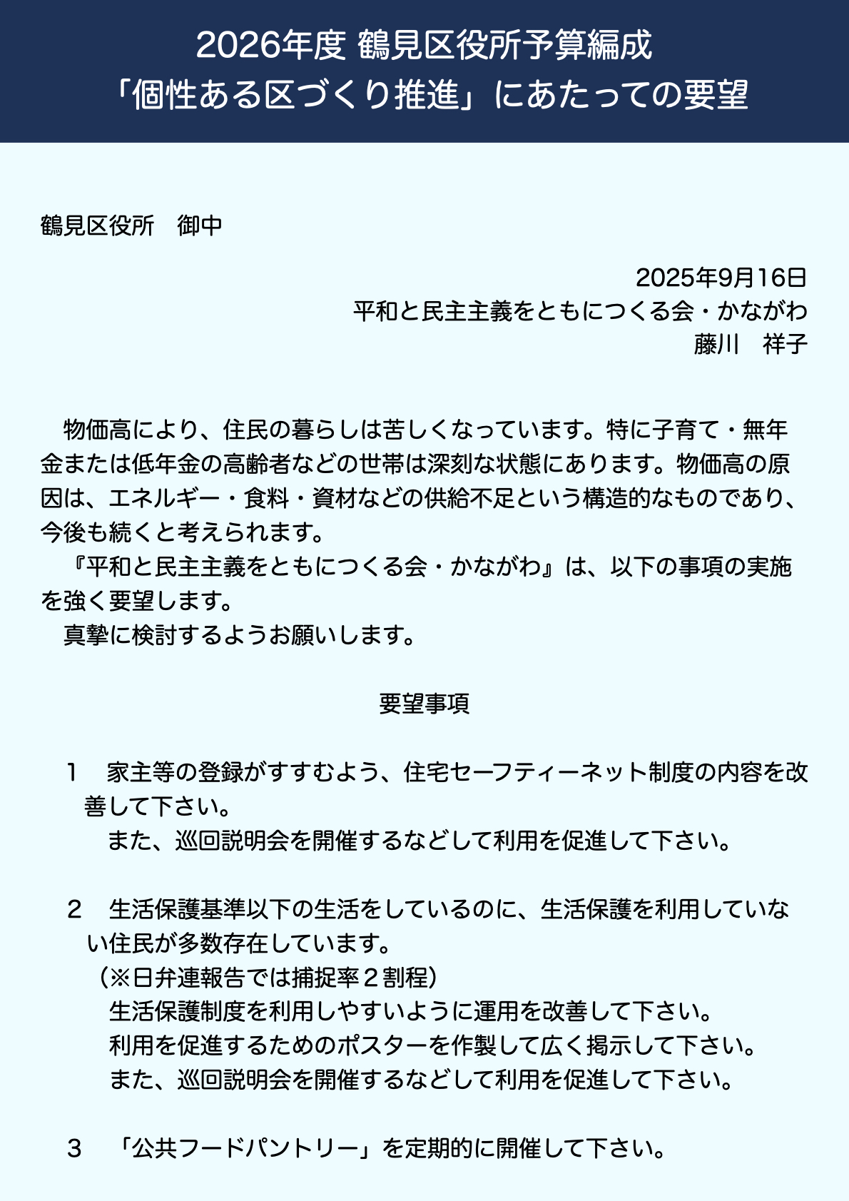 9月16日に「平和と民主主義をともにつくる会・かながわ」は、横浜市と鶴見区に対して「2026年度 横浜市予算編成にあたって物価高に対抗する積極的予算編成の要望」書を提出しました。